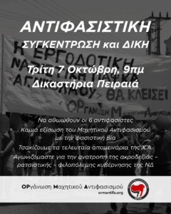 Στις παρεμβάσεις των τοπικών πυρήνων, ενημερώσαμε και καλέσαμε τον κόσμο στην αντιφασιστική συγκέντρωση και δίκη της Τρίτης 7/10/2025, 9.00 π.μ. στα δικαστήρια Πειραιά, για την υπόθεση της φασιστικής ενέδρας στο Πέραμα από τους νεοναζί της Χ.Α σε βάρος μελών της ΟΡ.Μ.Α. το 2018, καθώς απαιτούμε την αθώωση των έξι αντιφασιστών που δικάζονται με παράλληλη καταδίκη των φασιστών τραμπούκων.