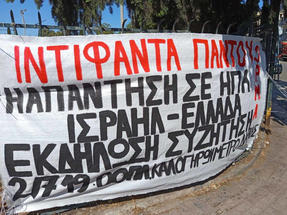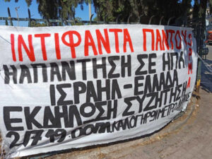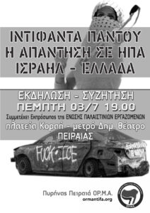 - Πέμπτη 3 Ιουλίου, 19:00, στην πλατεία Κοραή, Μετρό Δημοτικό Θέατρο, Πειραιάς, με συμμετοχή εκπροσώπου απο την Ένωση Παλαιστινίων Εργαζομένων.