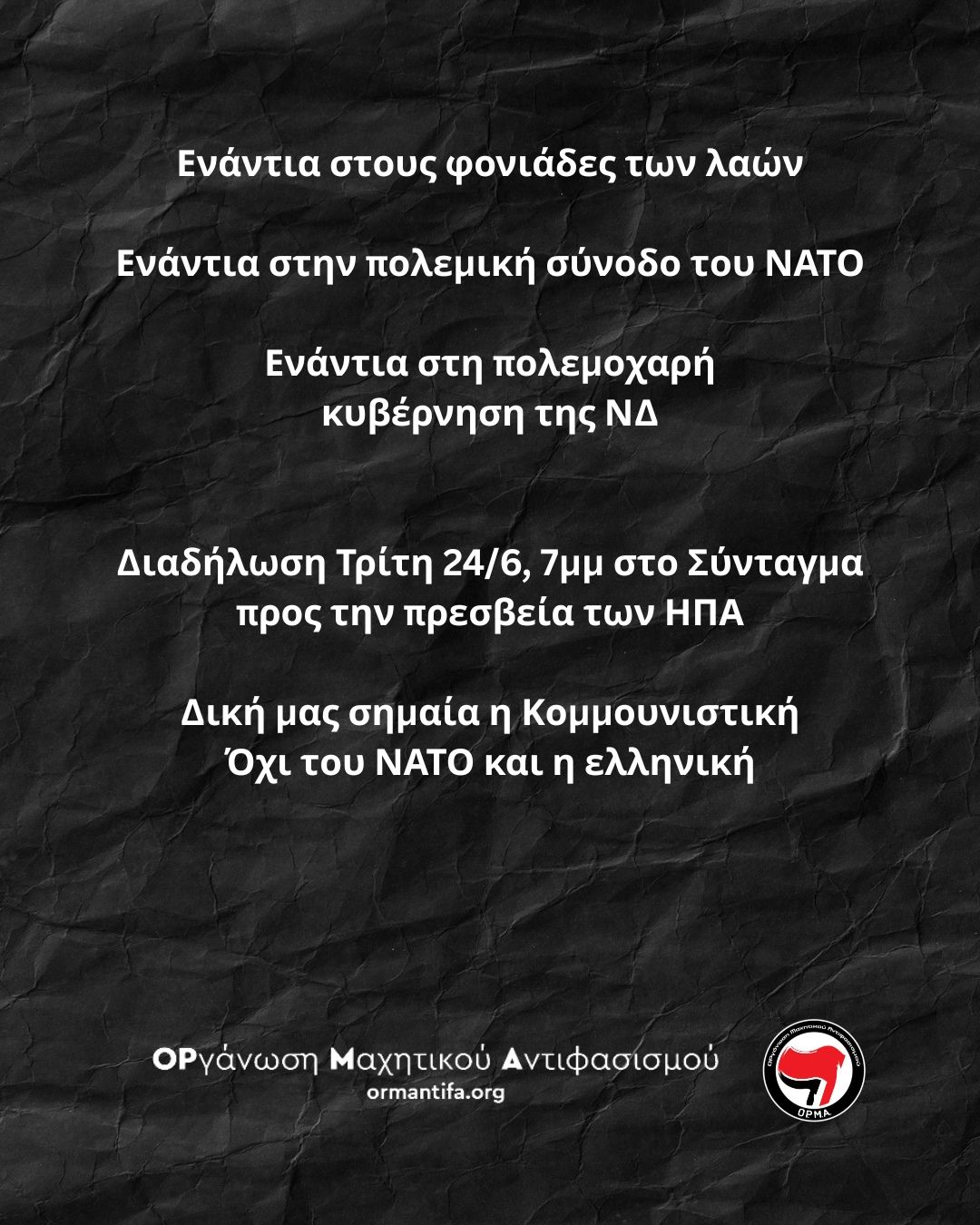 Καμιά συμμετοχή στους πολεμικόυς σχεδιασμούς του ΝΑΤΟ και τη Σύνοδο Κορυφής που πραγματοποιείται 24 και 25 Ιουνίου ακριβώς για νέες πολεμικές προετοιμασίες σε Ουκρανία – Μέση Ανατολή. Στεκόμαστε ενάντια στο ReArm Europe της ΕΕ που στηρίζει τον όλεθρο και την συνέχεια του πολέμου σε Ουκρανία και την γενοκτονία στη Λωρίδα της Γάζας από τους σιωνιστές.