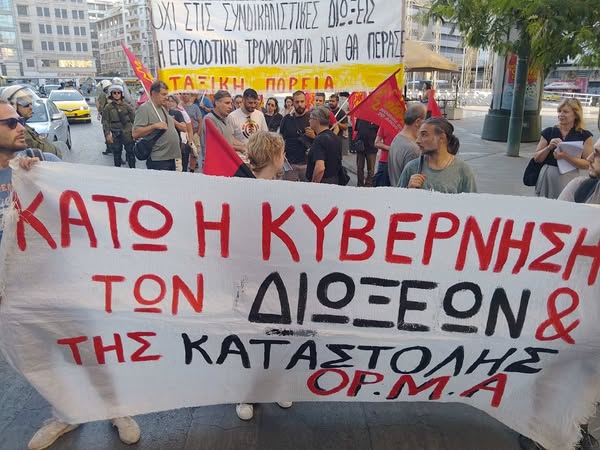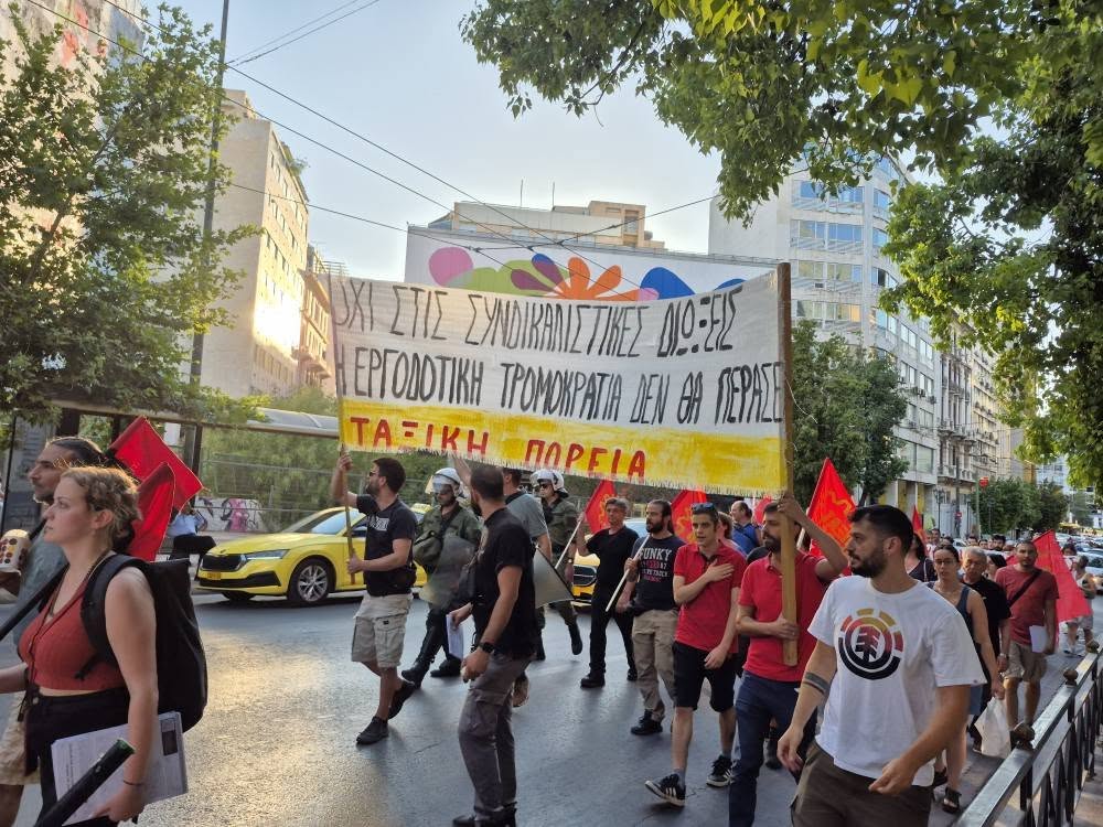 Προκλητική ήταν και η παρουσία των ΜΑΤ, τα οποία τοποθετήθηκαν δίπλα από την πορεία και τη συνόδευαν καθ’ όλη τη διάρκειά της, επιχειρώντας να ασκήσουν πίεση και εκφοβισμό στους διαδηλωτές.Τα μπλοκ της Αντεπίθεσης των εργαζομένων, της ΟΡΜΑ, της Ταξικής Πορείας και του ΜέΡΑ25 που συμμετείχαν στη διαδήλωση, πραγματοποίησαν συμβολική στάση στο Υπουργείο Εργασίας. Στη συνέχεια κατευθύνθηκαν προς το Σύνταγμα, όπου ενώθηκαν με τη συγκέντρωση αλληλεγγύης στους μετανάστες που είχε οργανωθεί από αντιρατσιστικούς φορείς, ενάντια στο νέο αντιμεταναστευτικό κρεσέντο της ακροδεξιάς κυβέρνησης.