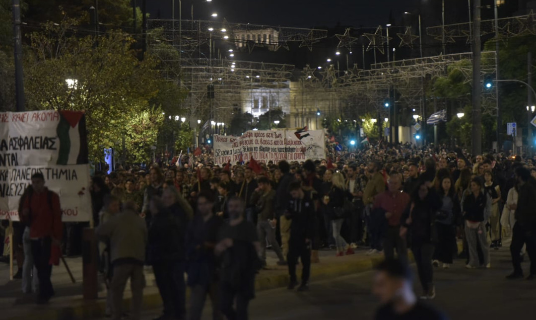 Με παλαιστινιακές σημαίες και συνθήματα για την λευτεριά και την νίκη της αντίστασης από το ποτάμι ως τη θάλασσα, ο κόσμος δηλώνει παρών στη μάχη ενάντια στην συνεχιζόμενη γενοκτονία από τους σιωνιστές σφαγείς. Με εναντίωση στην αιματοβαμένη συνεργασία της Ελλάδας με το κράτος-τρομοκράτη του Ισραήλ. Πρέπει να προωρήσουμε πρωτοβουλίες και να μην μείνουμε παρακολουθούμε αμήχανοι την καταρρέουσα “συνθήκη ειρήνευσης” του Τραμπ για την Παλαιστίνη που μετα το ψήφισμα του Συμβουλίου Ασφαλείας του ΟΗΕ κατοχυρώνει τον ιμπεριαλιστικό στρατο των ΗΠΑ ως τοποτηρητή και ρυθμιστή στη Γάζα με σκοπό τον αφοπλισμό και την διάλυση της ενοπλης αντίστασης.