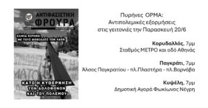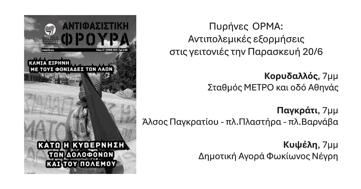 Οι Πυρήνες της ΟΡ.Μ.Α. θα πραγματοποιήσουν αντιπολεμικές εξορμήσεις σε Κορυδαλλό – Παγκράτι – Κυψέλη, αύριο, Παρασκευή 20 Ιουνίου. Τονίζουμε την ανάγκη για μια ανεξάρτητη διεθνιστική κομμουνιστική στρατηγική ως απάντηση στους πολέμους των σιωνιστών και των ιμπεριαλιστών.