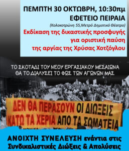 Την Πέμπτη 30/10 στις 10.30πμ η “Ανοιχτή Συνέλευση Ενάντια στις Συνδικαλιστικές Διώξεις και Απολύσεις” καλεί σε συγκέντρωση έξω από το Διοικητικό Εφετείο Πειραιά (Κολοκοτρώνη 55) για την εκδίκαση της αίτησης ακύρωσης της δυνητικής αργίας της εκπαιδευτικού και μέλους του Δ.Σ. της ΕΛΜΕ Πειραιά Χρύσας Χοτζόγλου.