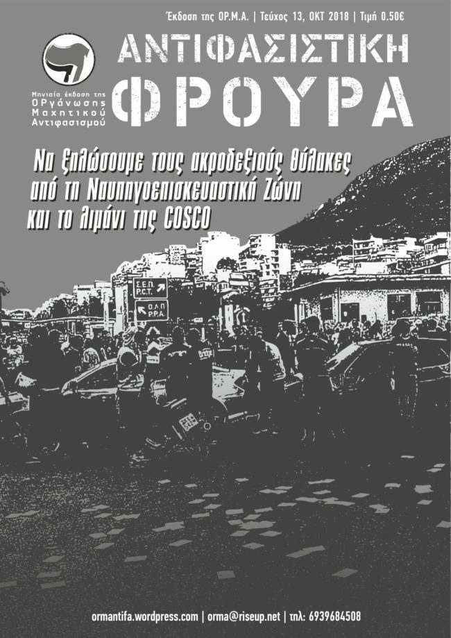 Πέντε χρόνια από την φασιστική – δολοφονική ενέδρα των νεοναζί της Χ.Α. του εργοδοτικό σωματείου – γιάφκας “Άγιος Νικόλαος” σε μέλη και φίλους της ΟΡΜΑ κατά τη διάρκεια διεθνιστικής παρέμβασης στο Πέραμα. Το λακέδικο εργοδοτικό σωματείο λειτουργούσε ως μέσο τρομοκράτησης των εργαζομένων της εργοδοσίας της Ναυπηγοεπισκευαστικής Ζώνης. Η ΟΡΜΑ είχε παρεμποδίσει πολλές φορές τη φασιστική…